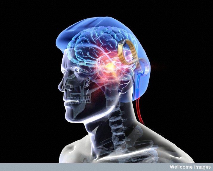 Illustration of male head, neck and shoulders with brain, vertebrae, ribs and jaw bone visible through transparent skin. Wires attach to the brain.